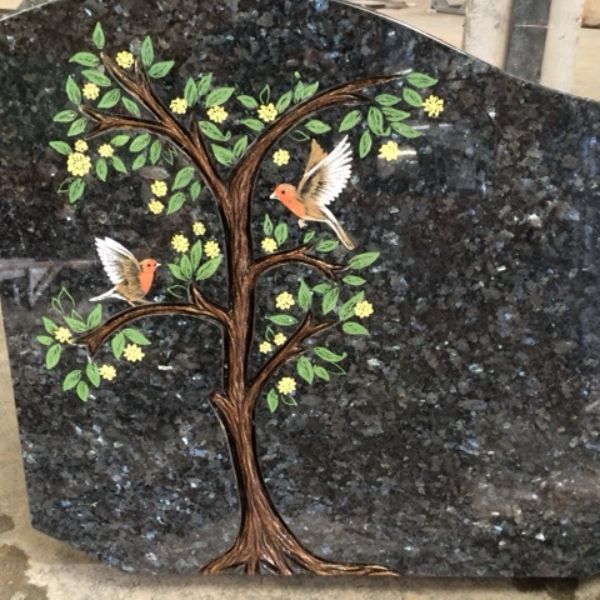 Réalisée directement dans le granit brut, cette sculpture en relief crée un effet de profondeur. Les formes, symboles ou motifs sont travaillés à la main ou à l’aide d’outils spécialisés, puis éventuellement peints pour en souligner les détails. Durable et résistante, cette technique met en valeur le monument funéraire en alliant force minérale et finesse artistique.